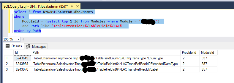 We now need to find all lasernet fields in our custom model that slipped through and remove them. We will use the XREF db for this. Whenever you compile code (FULL model build!) Visual Studio will write all elements and calls (in and outgoing) into ‚DYNAMICSXREFDB‘.